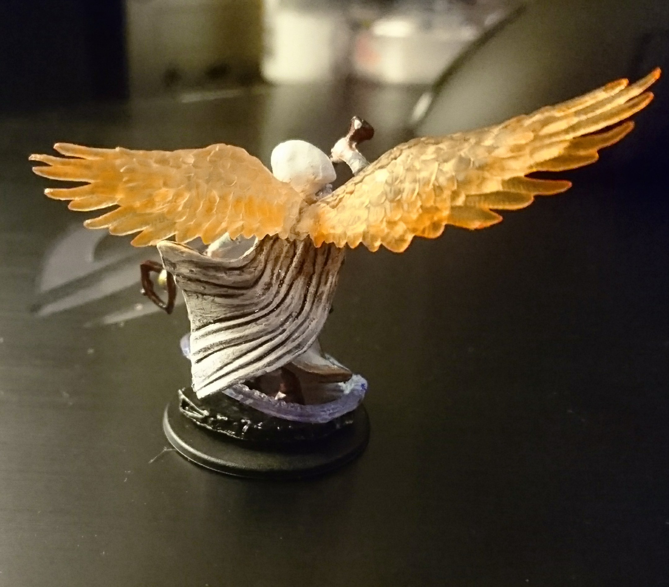 The wings took on the orange paint pretty well. I wanted to keep them transparent so I watered down the paint out quite a bit and applied it broadly. I then brushed off any excess with another dry brush before it set and stayed opaque. Unfortunately the same technique didn’t adhere quite as well when I tried it on the smoother surface of the spell effect near the base. I used light blue, dark blue or purple paint in that instance but perhaps I’ll try red or yellow and see how that works in future.