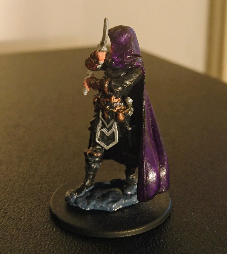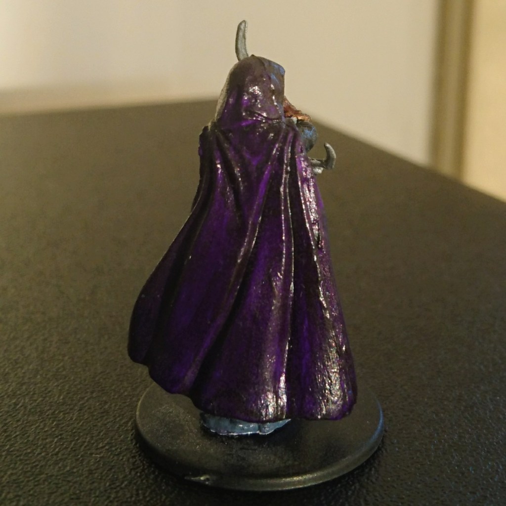 Originally I intended for a white upper cape and grey mid section. Unfortunately the white cape and grey looked too simple and the grey like unfinished, uncoated primer. In the end I added very runny black over the cape which filled in the crevasses, extenuating the shadows and details in the miniature. I tried for a similar effect on the grey area and added some metal highlights (using a permanent marker) to make it look more complete.